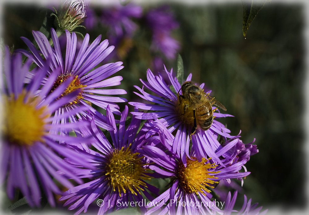 From September 2008. I followed this bee around, hopping from flower to flower. Finally it stopped for a few seconds and was able to capture this shot. Peaked up the colours and sharpened some areas. I love getting these types of shots. It gives an insight to the world of insects. (Sept 2008)