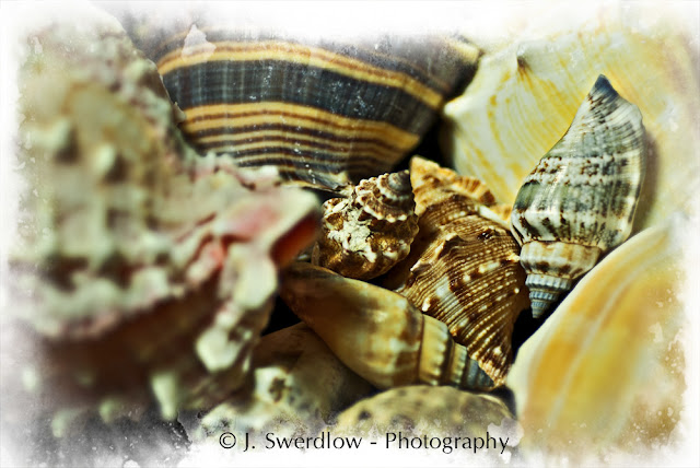 I have a box of shells. I dumped them on a black background, I used my 66mm Macro and some artificial light. Used OnOne filters to enhance and to frame, I got a picture. Enjoy.. (january 2012)
